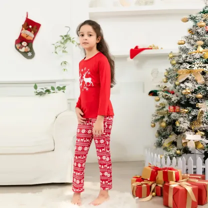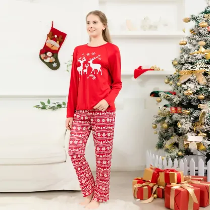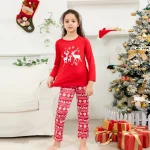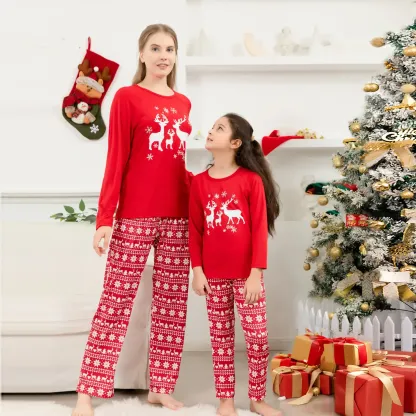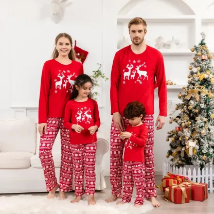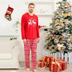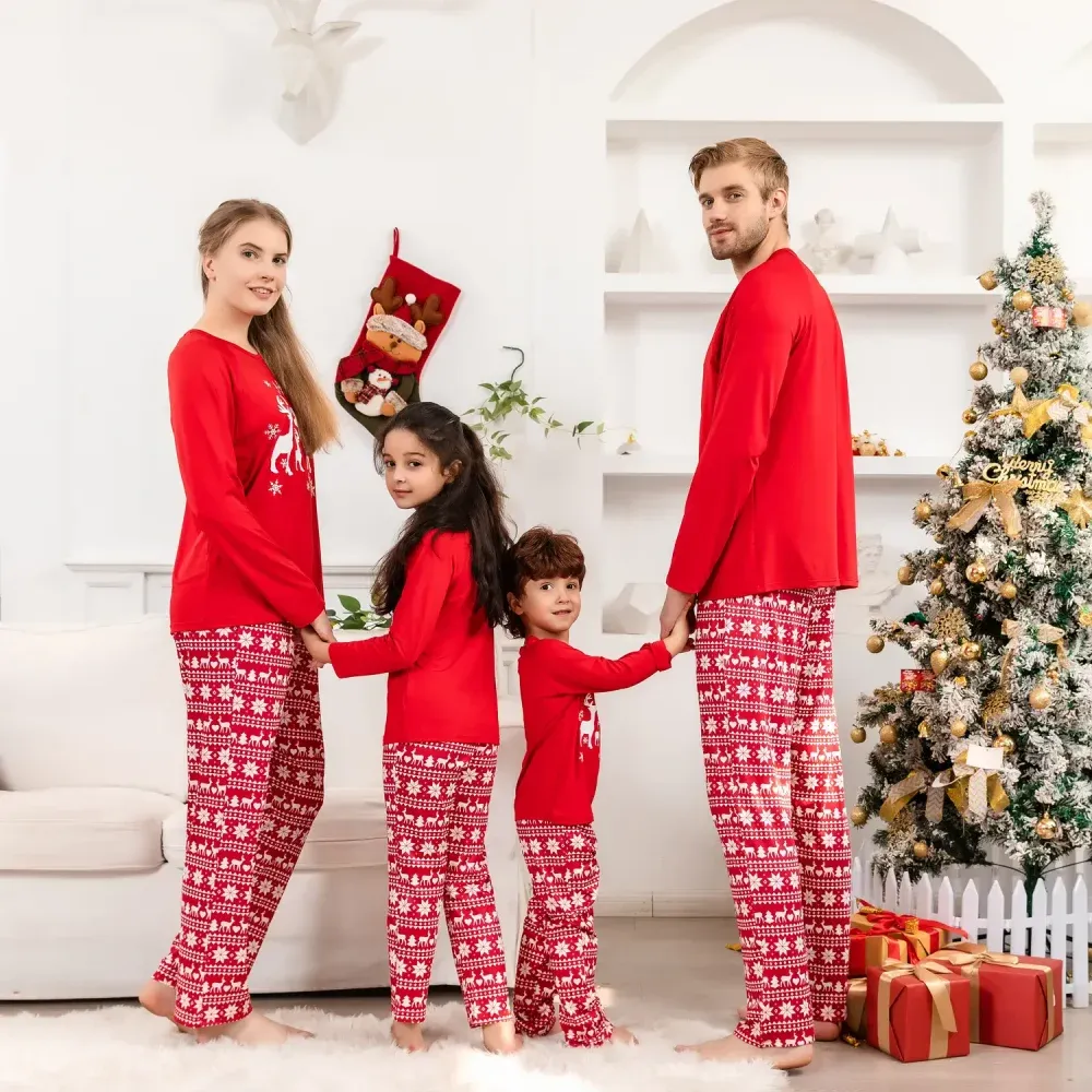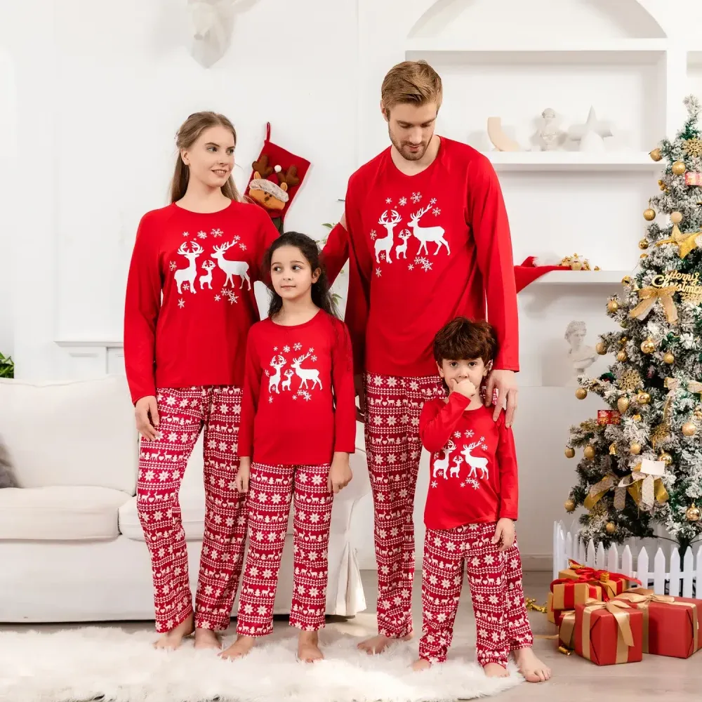 Designed for cozy family gatherings and festive celebrations, this set offers both style and comfort, making it ideal for Christmas morning photos, holiday parties, or simply relaxing at home. The reindeer design brings a timeless and heartwarming element to the pajamas, ensuring that every moment spent in them feels like a cherished holiday tradition. Celebrate the season with a set that embodies the essence of Christmas, blending vibrant color with festive elegance.