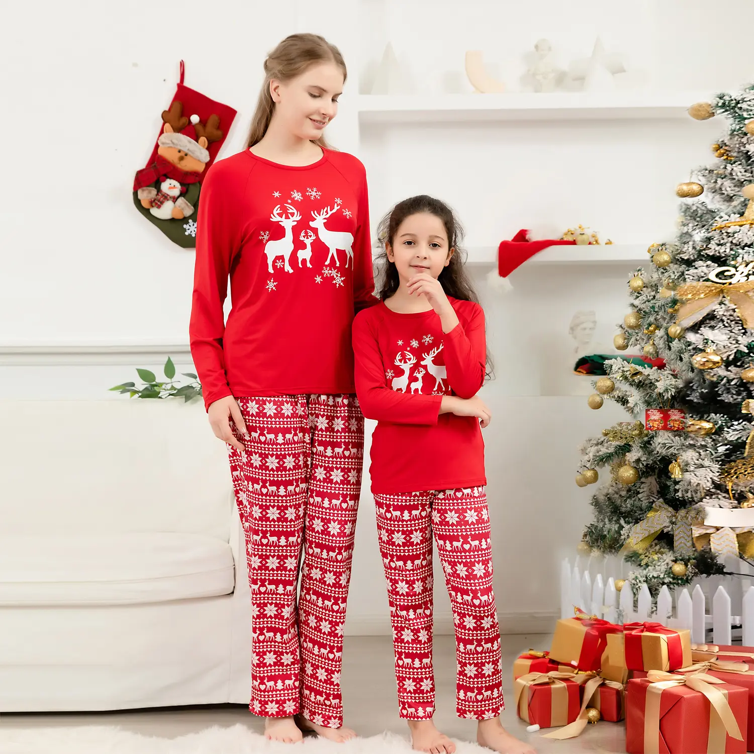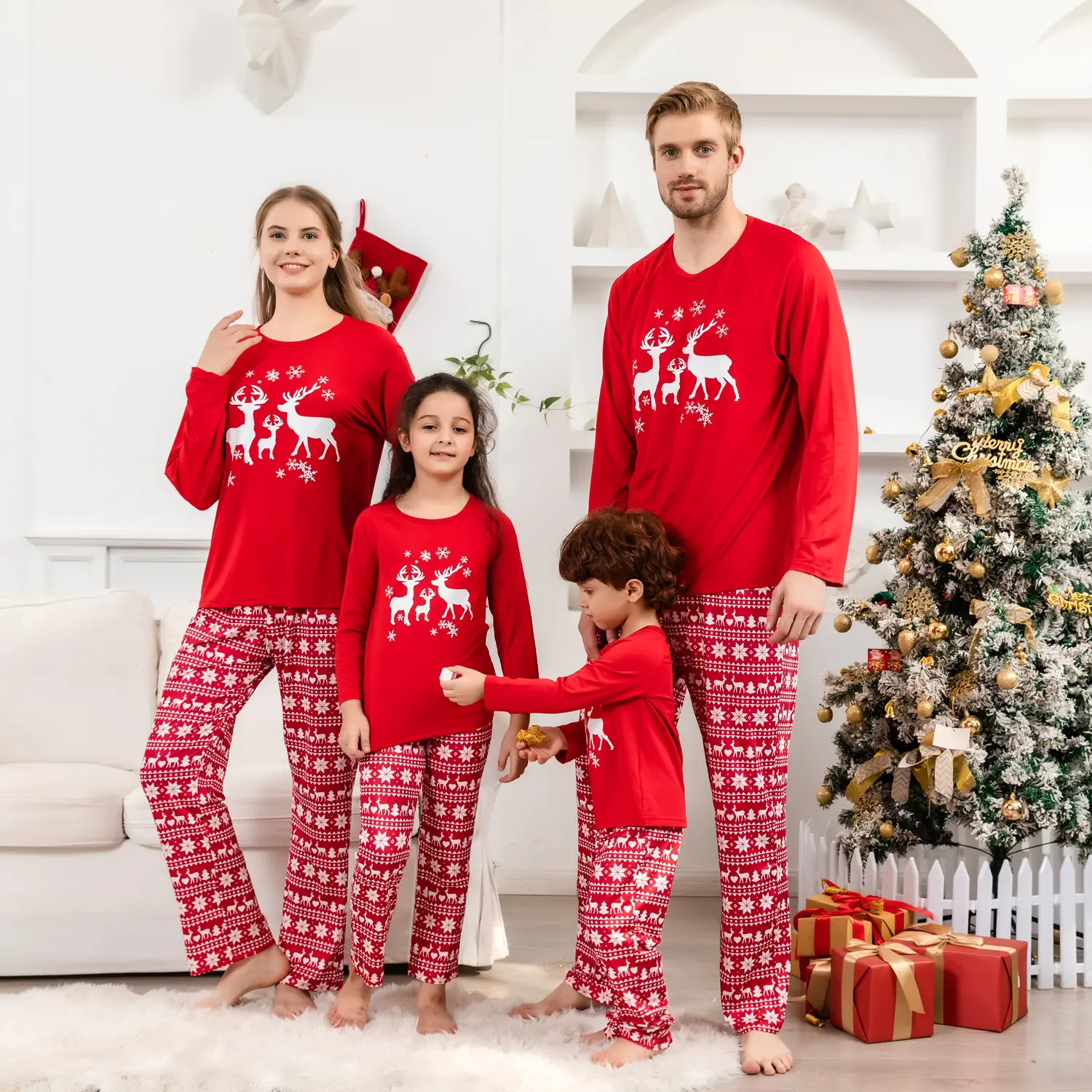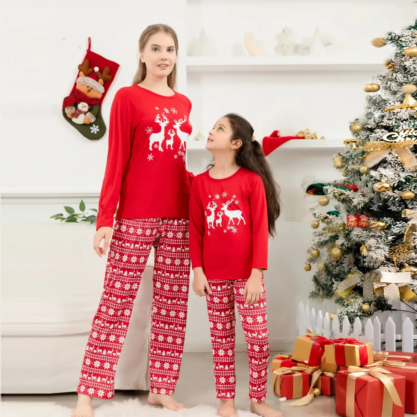 Designed for cozy family gatherings and festive celebrations, this set offers both style and comfort, making it ideal for Christmas morning photos, holiday parties, or simply relaxing at home. The reindeer design brings a timeless and heartwarming element to the pajamas, ensuring that every moment spent in them feels like a cherished holiday tradition. Celebrate the season with a set that embodies the essence of Christmas, blending vibrant color with festive elegance.